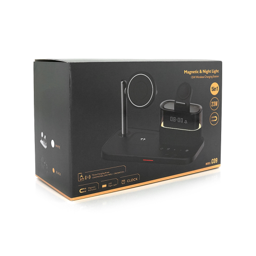 Бездротова зарядка+ годинник C-09 5в1, під телефон+годинник+навушники, магніти, White, Box