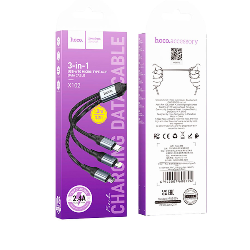 Кабель HOCO X102 USB-1 3 in 1 Micro / Iphone / Type-C, 2A, довжина 1м, Black, Box