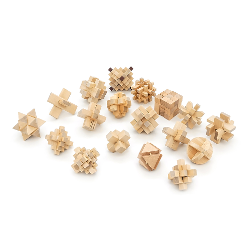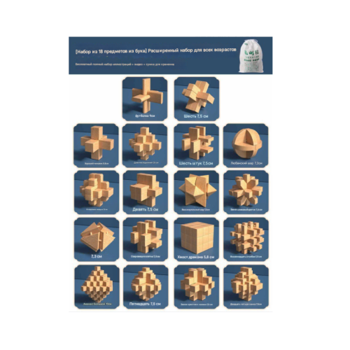 Набір 3D з 18-головоломок. Метріал: дерево. Розміри елементів 5,7-10 см. Сумка для зберігання. 260х160х180 мм. Вага: 1.270 кг.