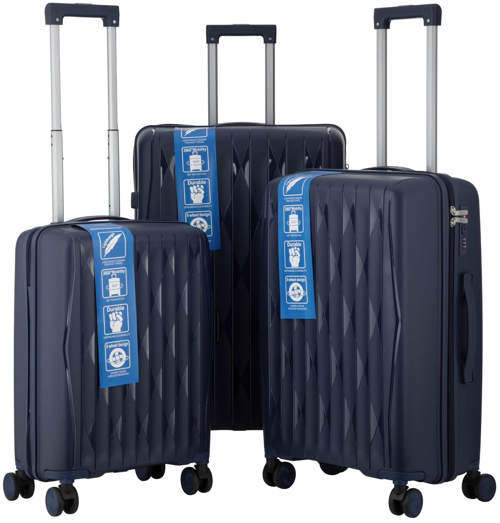 Набір валіз 2E, M7979, поліпропілен, (L+M+S), блискавка anti theft, 4 колеса, кодовий замок, темно-синій