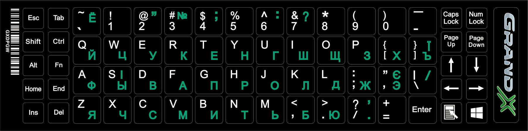 Наклейки на клавиатуру Grand-X 68 keys Cyrillic green, Latin white (GXDPGW)