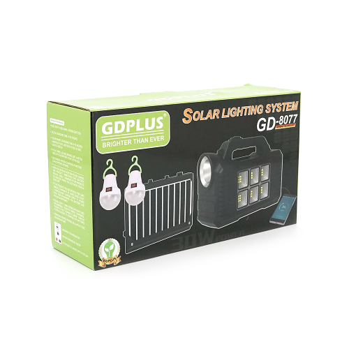 Переносний ліхтар GD-8077+ Solar, 1+1 режим, вбудований акум, 3 лампочки 3W, USB вихід, Black, Box