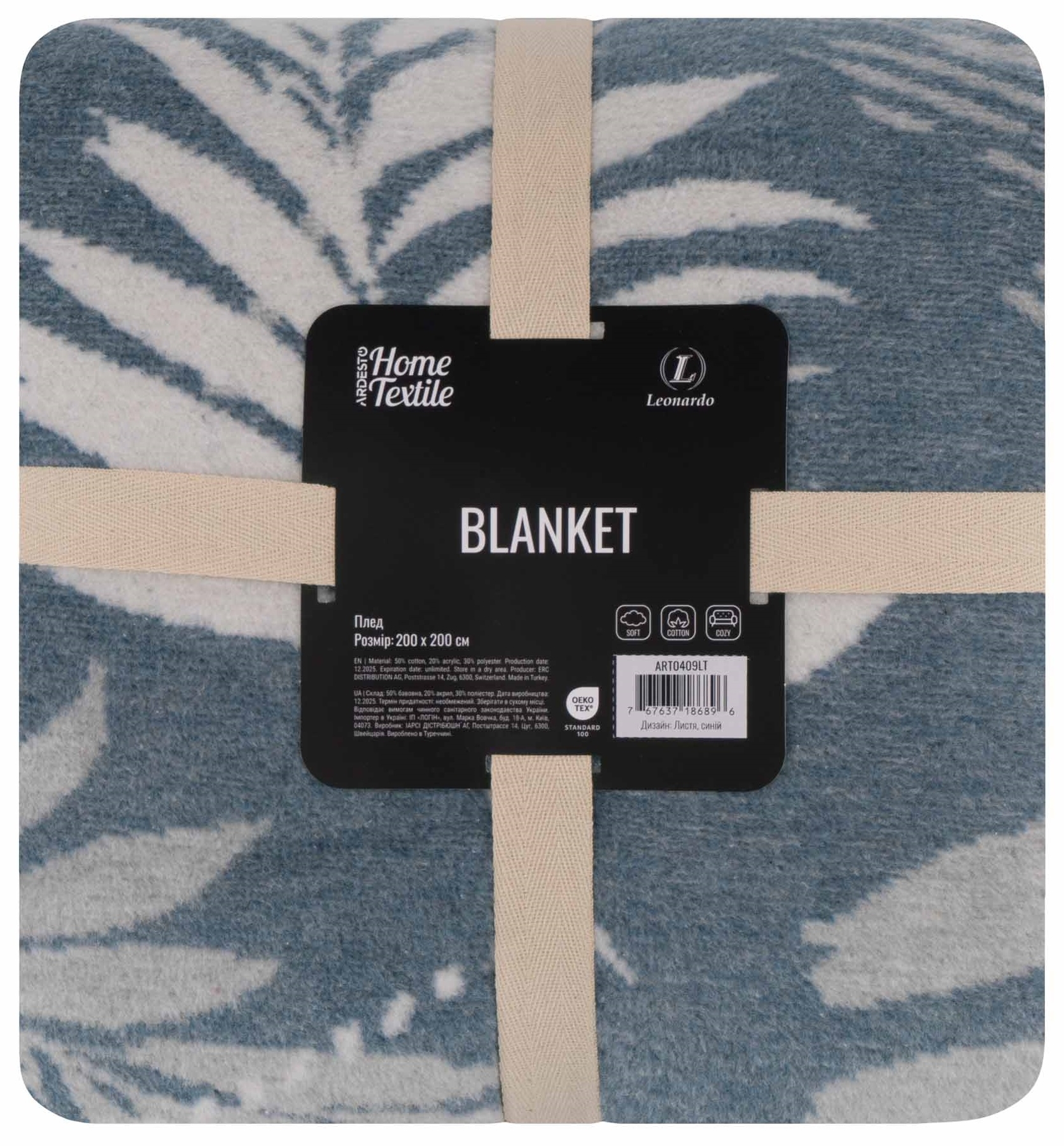 Плед ARDESTO Leonardo 200х220см, 50% бавовна, 30% поліестер, 20% акрил, листя, синій