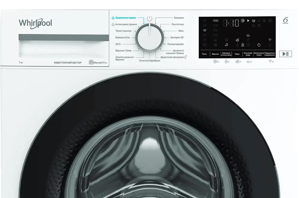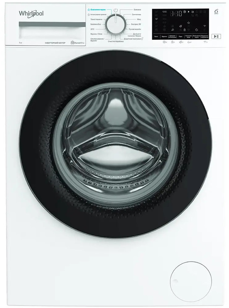 Пральна машина Whirlpool фронтальна, 7кг, 1200, A+++, 49.6см, дисплей, пара, інвертор, люк чорний, білий